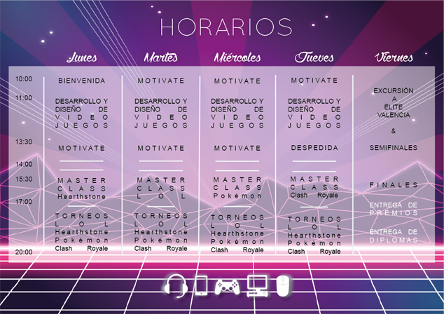 Señalar que por las tardes el salón de actos estará abierto a todo el que quiera participar en las master classes y torneos. Con prioridad para el alumnado, las master classes serán dirigidas por grandes profesionales de cada e-Sport: Edgar “Piter” Martínez y Manuel “Bobby” Baena, del equipo e-Sports Valencia sobre Hearthstone; Shamara, de Ramboot Club será la encargada de League of Legends, Edu traerá grandes trucos sobre Pokémon Sol y Luna y Carlos “MG”, sobre Clash Royale. Cada tarde tendrá el protagonismo un e-Sport diferente.