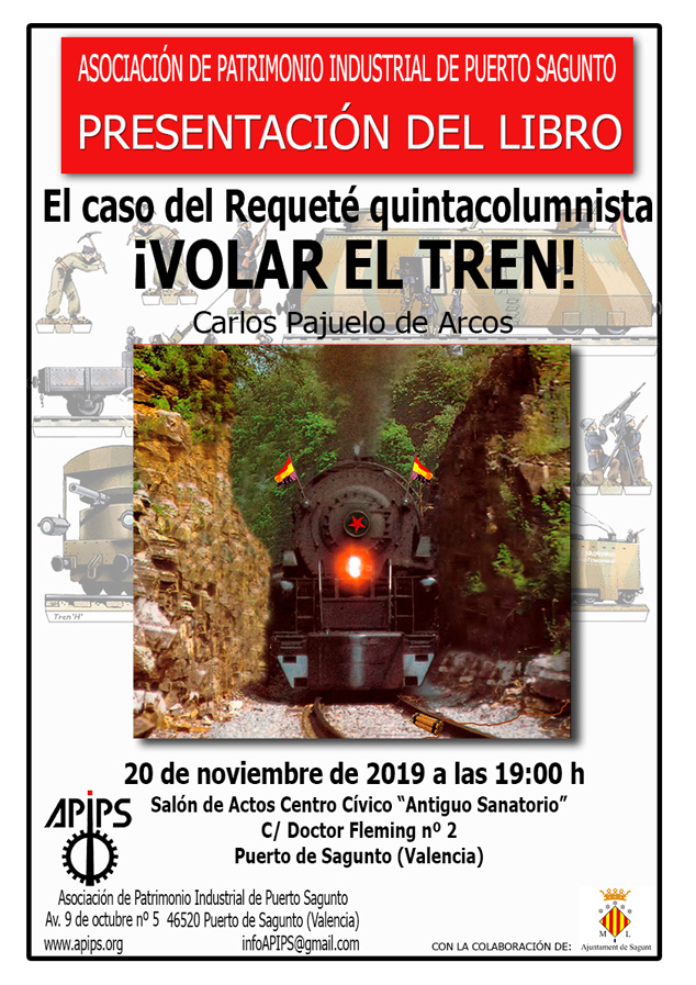 La Asociación de Patrimonio Industrial de Puerto Sagunto ha organizado la presentación del libro titulado ‘El caso del Requeté quintacolumnista. ¡Volar el tren!’. El acto, en el que colabora el Ayuntamiento de Sagunto, tendrá lugar el próximo miércoles, 20 de noviembre, a las 19 horas en el salón de actos del Centro Cívico Antiguo Sanatorio de Puerto de Sagunto.