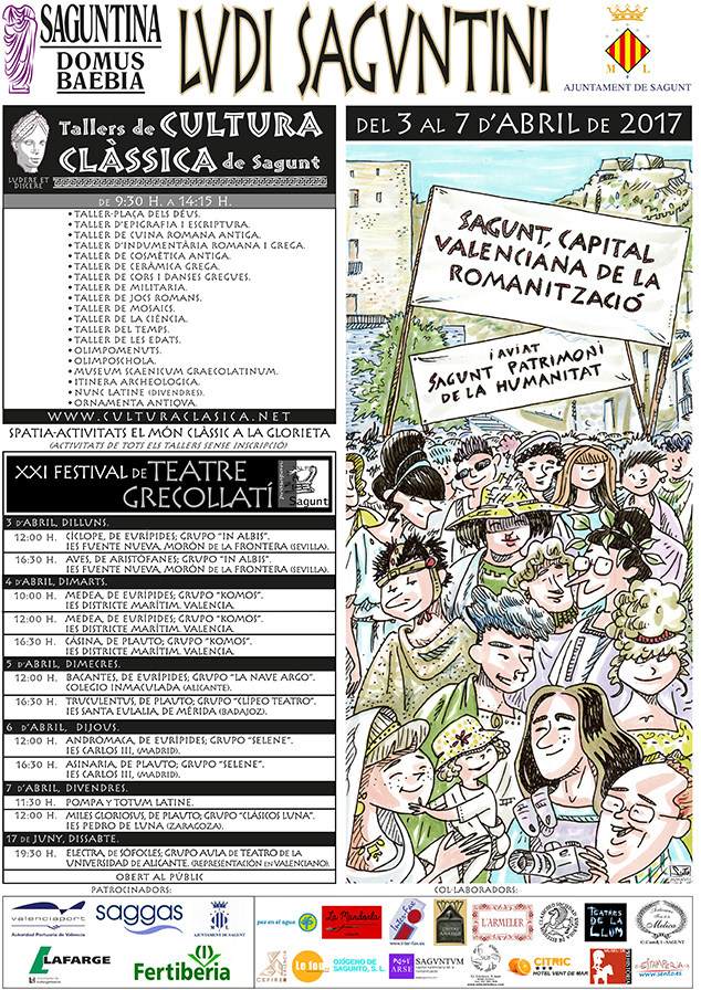 Más de 14.000 alumnos y alumnas de secundaria y curiosos de la cultura grecolatina tienen de nuevo una cita obligada en Sagunto, del 3 al 7 de abril, en la XXI edición de los Ludi Saguntini. Un año más, las asociaciones Ludere et Discere y Prósopon Sagunto junto al Ayuntamiento de Sagunto y la Conselleria de Educación organizan este festival dedicado a promover y acercar al alumnado de secundaria la cultura grecolatina con actividades, talleres y representaciones de obras de teatro clásicas. Además, cuenta con la colaboración de la Domus Baebia y el patrocinio de diferentes empresas y entidades locales.