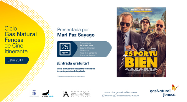El próximo 25 de agosto, Sagunto acogerá la proyección del largometraje Es por tu bien con motivo del ciclo Gas Natural Fenosa de Cine Itinerante Verano 2017. La iniciativa impulsada conjuntamente por Gas Natural Fenosa y la Academia de Cine, hará parada en Sagunto con la asistencia de una de las protagonistas de la película, Mari Paz Sayago, quien la presentará en un coloquio que complementará la proyección y permitirá a los cinéfilos del municipio descubrir las curiosidades y anécdotas del rodaje.