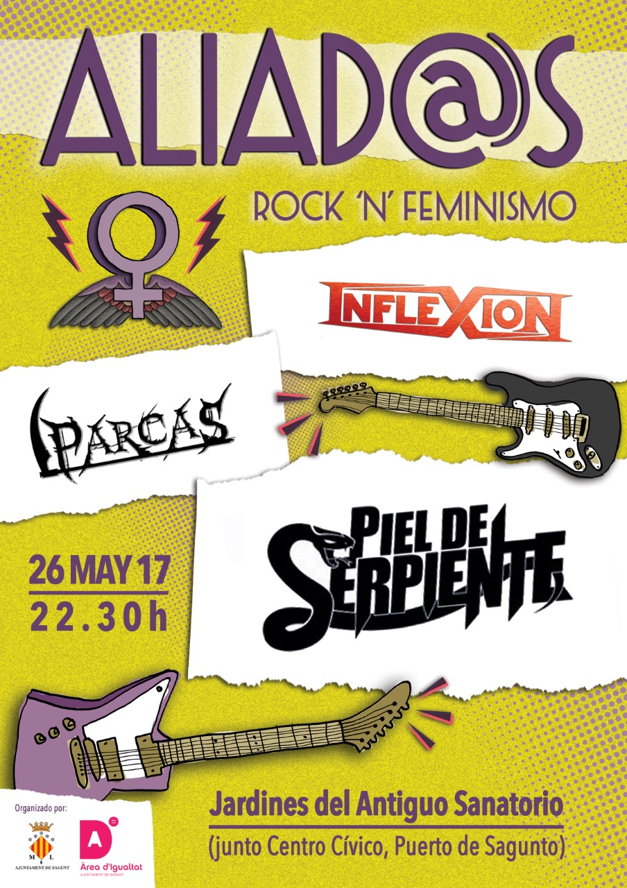 El área de Igualdad del Ayuntamiento de Sagunto ha programado para el próximo viernes 26 de mayo el concierto “ALIAD@S, Rock ´n´Feminismo”. El evento será totalmente gratuito y tendrá lugar a partir de las 22.30 horas, en la explanada de los Jardines del Antiguo Sanatorio (frente al Centro Cívico) del Puerto de Sagunto.