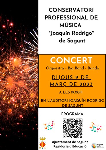 El jueves, 9 de marzo, habrá un concierto de la Orquesta, la Big Band y la Banda en el Auditorio Joaquín Rodrigo de Sagunto. La hora del concierto es a las 19.00. El concierto empezará con la Orquesta, que interpretará la Dansa dels acròbates ‘La doncella de Nieve’ (Rimsky-Korsakow, con arreglo de Sandra Dackow); el Impromptu para cuerdas, op.5 (J. Sibelius); y para acabar el Preludio y allegro, en estilo de Pugnani (F. Kreisler), con la violinista Claudia Martínez como solista. Los directores de la orquesta serán Francisco Hernández y Mª José Canet. Así mismo, la Big Band, dirigida por Francisco Garfella, interpretará los temas Work Son (Nat Adderley, con arreglo de Erik Morales); City Dock (W. S. Ragsdale); Cry me a river (A. Hamilton); y Orange color sky (M. DeLugg & W. Stein, con arreglo de R. Holmes). Finalmente, la Banda tocará las piezas Saxflight (A. Crepin), con el saxofonista Sergio Garfella como solista; Ross Roy (J. De Haan); y Chic Mambo i Numen (R. Doménech). La banda interpretará las obras bajo las batutas de Mónica Navarro, J. Ignacio Ruiz y Rafael Doménech.