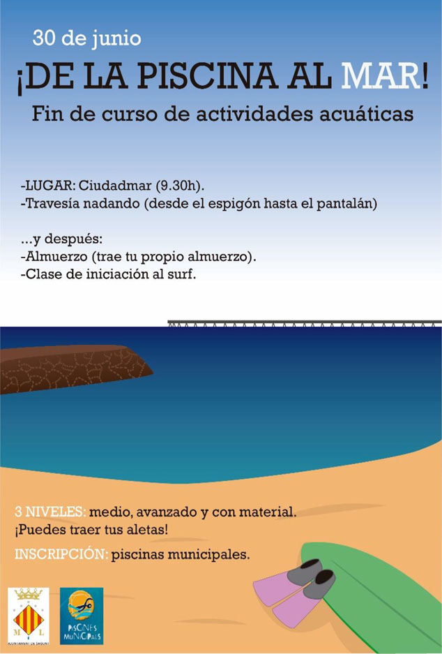 El sábado 30 de junio se realizará “¡De la piscina a la mar!”, la salida de fin de curso de Actividades Acuáticas del Ayuntamiento de Sagunto. El objetivo de este evento es nadar en el mar a lo largo de la playa de Puerto de Sagunto desde el espigón hasta el pantalán. Se trata de una actividad abierta y totalmente gratuita y accesible, puesto que se organizarán tres niveles (medio, avanzado y con material) para realizar el recorrido.La formación, dirigida al sector turístico, las asociaciones y la ciudadanía, estará dividida en cuatro bloques
