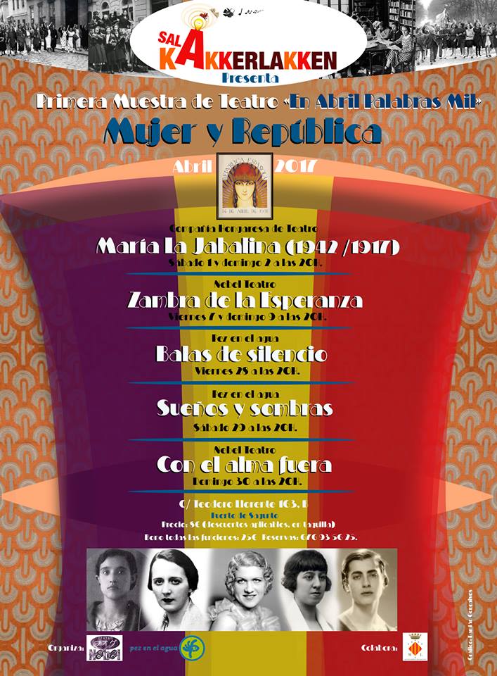 La I muestra de teatro Abril, palabras mil es un ciclo que, como explican desde la organización, se ocupa de recordar a todas aquellas mujeres condenadas al olvido, valientes, pioneras en el arte y en su compromiso social y político, que vivieron un tiempo apasionante y terrible, doblemente damnificadas por su condición de mujeres.