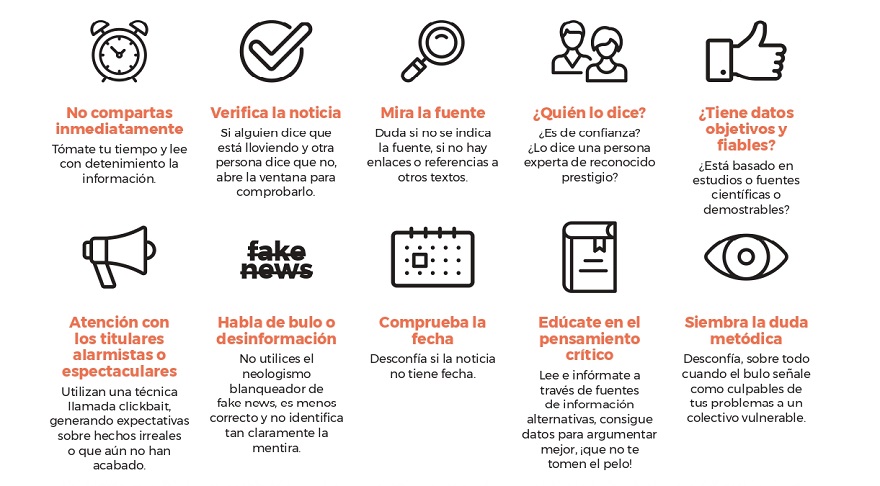 Por tanto, para desmontar estos bulos, noticias falsas, mentiras y manipulaciones, la asociación desgrana una serie de consejos para ello, entre los que se encuentran no compartir contenidos inmediatamente sin leerlos, verificar la noticia que tenemos enfrente, mirar la fuente, estudio o referencia y siempre tener en claro quién dice o publica el contenido de comunicación. Además, la fundación apunta que cuando se consulten las noticias se tiene que comprobar la fecha y, en caso de no tener, se tendría que desconfiar.