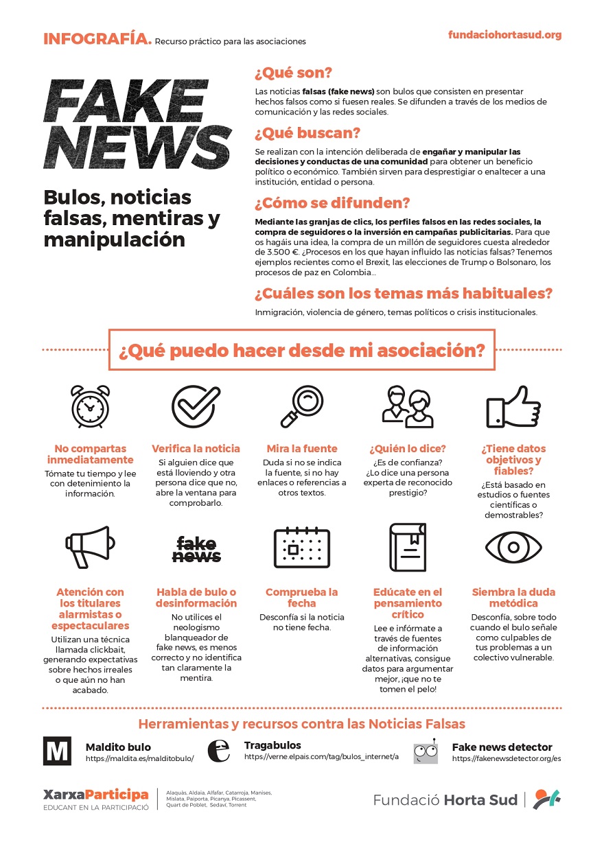 La Fundació Horta Sud en su infografía formativa define como noticias falsas aquellos contenidos que consisten en presentar hechos falsos como reales y se difunden a través de los medios de comunicación y las redes sociales. Además, concreta que la intención es engañar y manipular las decisiones y conductas de una comunidad para obtener un beneficio político o económico, o bien, para desprestigiar o enaltecer a una institución, entidad o persona.