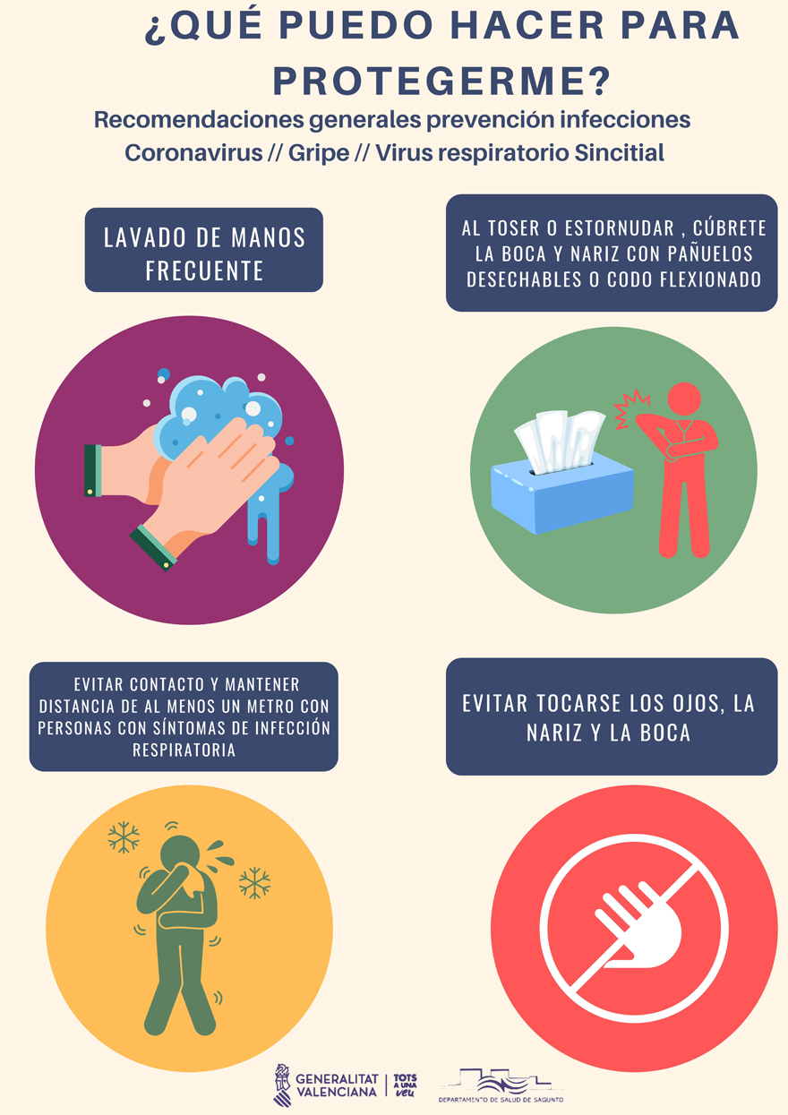 Según han informado desde la Conselleria de Sanidad Universal y Salud Pública, las recomendaciones se basan, en primer lugar, en que si no existen síntomas, se debe continuar con la vida normal. En estos momentos, solo hay un positivo y está bajo control. Si el número incrementase en los siguientes días, la ciudadanía sería conocedora ya que se mantiene un contacto constante con el Hospital de Sagunto.
