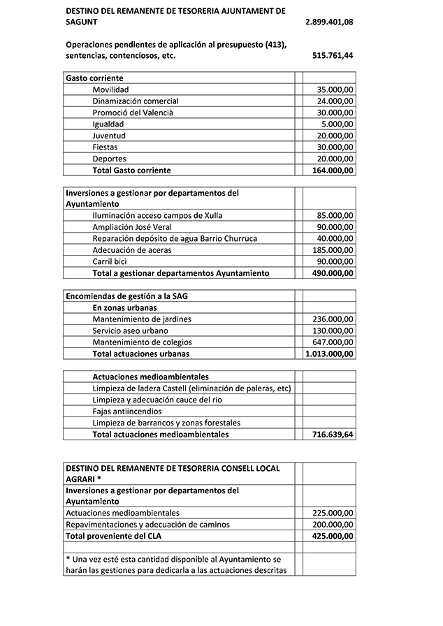 A continuación, se detalla el destino del remanente de Tesorería del Ayuntamiento de Sagunto y del Consell Local Agrari.