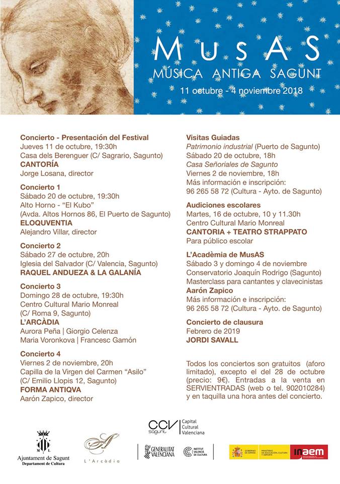 El festival de Música Antigua Sagunto MusAS de 2018 crece con respecto al año anterior. En esta edición se ha ampliado el número de conciertos y está marcada por la presencia de artistas de primer nivel y algunos de los grupos más importantes del momento. La presentación de la programación del festival tuvo lugar el pasado jueves 11 de octubre en la Casa dels Berenguer, en un acto presentado por el concejal de Cultura, José Manuel Tarazona, y el director del grupo local L’Arcàdia, Francesc Gamón.