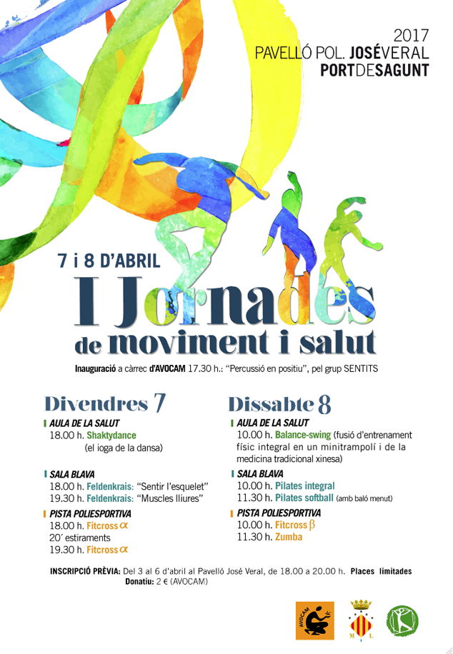 El área de Actividad Física y Salud del Ayuntamiento de Sagunto, en colaboración con AVOCAM (Asociación de Voluntariado Social del Camp de Morvedre), ha organizado las I Jornadas de Movimiento y Salud, con el objetivo de incidir en la necesidad de realizar actividades físicas orientadas hacia la salud de una manera responsable y divertida. La inauguración, que será a las 17.30 h, corre a cargo de AVOCAM, con el trabajo “Percussió en positiu” y el grupo SENTITS.