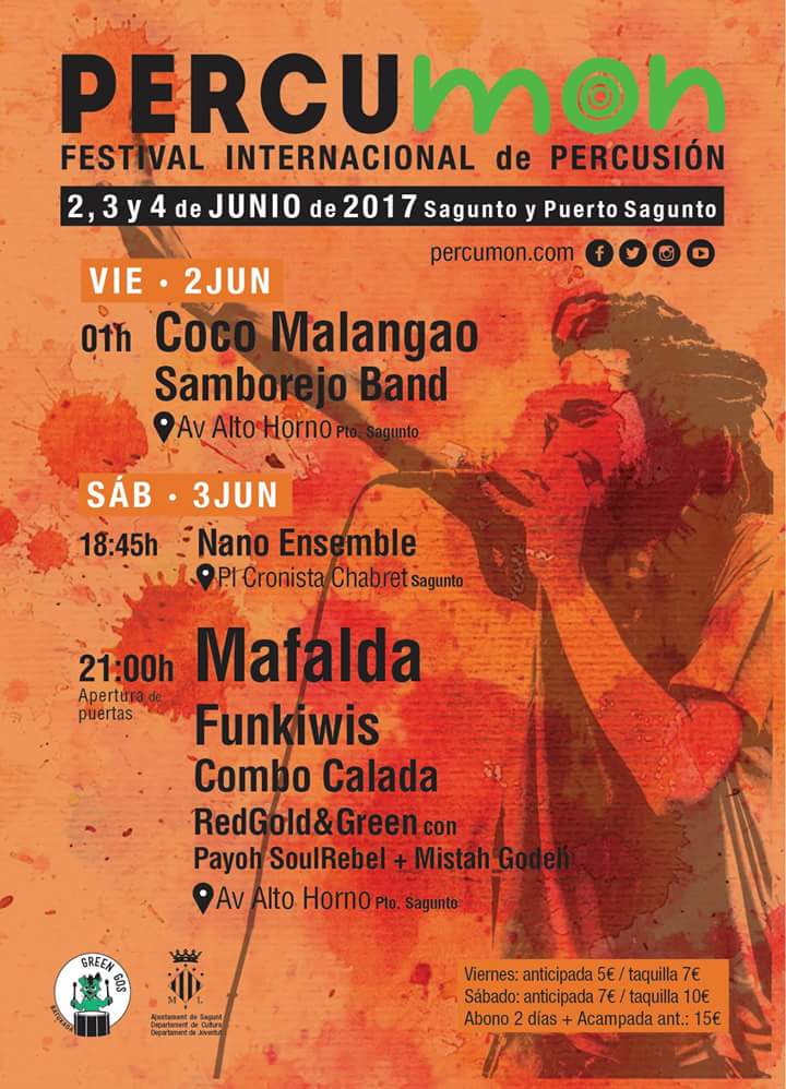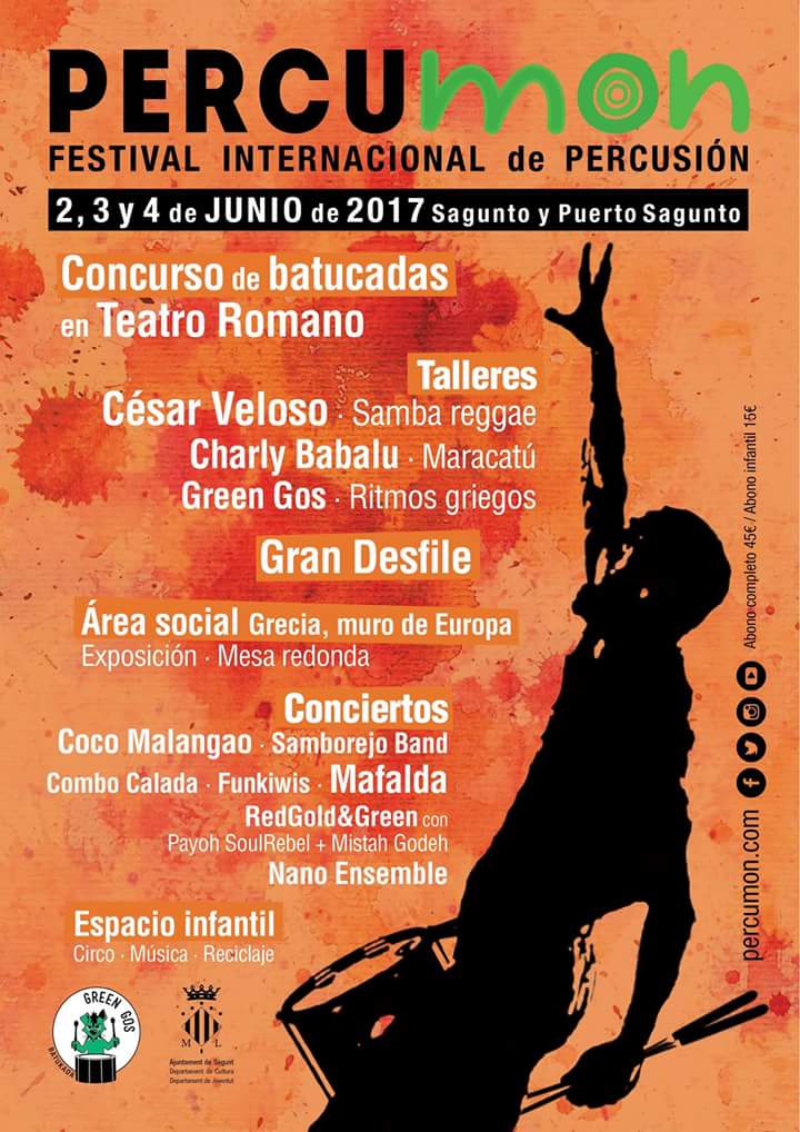 La segunda edición del Festival Internacional de Percusión Percumon llegará a Sagunto y Puerto de Sagunto el 2, 3 y 4 de junio. Organizado por Espectáculos HM Producciones y el grupo de batucada Green Gos en colaboración con las concejalías de Juventud, Cultura y Turismo del Ayuntamiento de Sagunto, el festival contará con un gran desfile de batucada, exposiciones, una mesa redonda, talleres y una serie de conciertos con bandas como Samborejo Band, Coco Malangao, Funkiwis o Mafalada, entre otras. En esta edición, el festival tendrá un carácter reivindicativo, ya que girará en torno a la crisis de refugiados que sufre Europa, el cual quedará reflejado en las diferentes actividades.