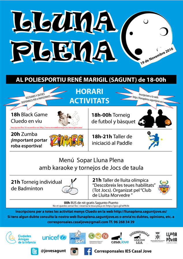 Este sábado 19 de noviembre se celebrará en el Polideportivo René Marigil la noche de actividades de ocio alternativo Lluna Plena, dirigida a jóvenes de entre 12 y 18 años. La iniciativa, organizada por el Casal Jove y las concejalías de Deportes y Juventud, comenzará a las 18 horas con el Black Game Cluedo en vivo, juego de rol dentro del Festival Novembre Negre y organizado por Games Valencia. A la misma hora darán comienzo sendos torneos de fútbol y básquet y un taller de iniciación al pádel.