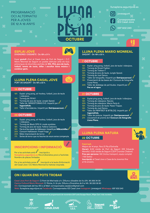 Las actividades de Lluna Plena, el programa de ocio para adolescentes que organiza la concejalía de Juventud del Ayuntamiento de Sagunto, continúan este sábado con nuevos talleres y más torneos. En este caso, los talleres se realizarán en el Casal Jove de Puerto de Sagunto, mientras que en Sagunto, en el Centro Mario Monreal, se realizará el Esplai Jove, donde se puede encontrar toda clase de juegos clásicos (futbolín, tenis de mesa, billar…), juegos de mesa y videojuegos (con Wii y PS4), que funcionarán todos los viernes y sábados de 18.00 a 21.00 horas.