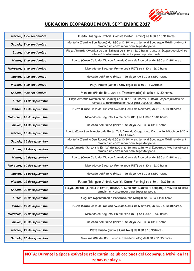 El Ayuntamiento de Sagunto recuerda que los vecinos pueden utilizar el servicio de ecoparque móvil, que se ubica cada día en un punto diferente del municipio, con la finalidad de facilitar el reciclaje de diversos tipos de residuos y evitar que acaben en zonas no autorizadas, pudiendo ocasionar daños medioambientales. Este servicio, que se ha reforzado durante el verano por la zona de la playa, complementa el servicio de recogida de residuos voluminosos que realiza la SAG.
