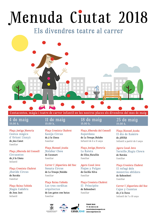 El viernes 25 de mayo a las 19 h se interpretarán simultáneamente: El día de Ramiro, por AMEBA en la plaza Manuel Azaña; Tornillo Magia Town, por Baraka en el Ágora del Casal Jove; El refugi dels monstres oblidats, por Rebombori en la plaza Cronista Chabret; y Cajas y cuentas, por A la Lluna en la calle l’Alquerieta del Roc.