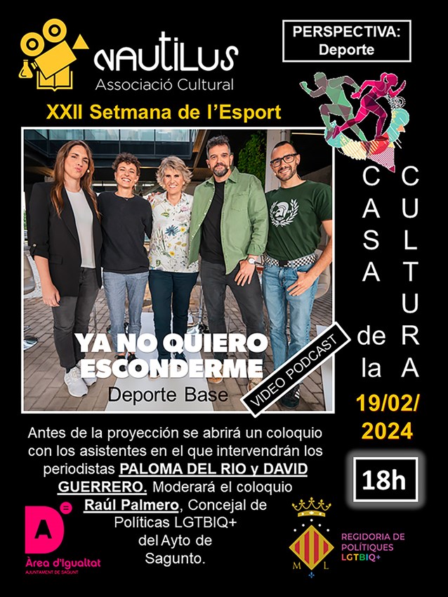 La siguiente actividad será la proyección del documental Ya no quiero esconderme, y un posterior coloquio con los periodistas y presentadores del documental, Paloma del Río y David Guerrero. Esta iniciativa está organizada por la asociación Nautilus y será en la Casa Municipal de Cultura de Puerto de Sagunto el 19 de febrero a las 18 horas.