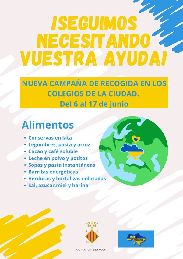 Desde el departamento de Servicios Sociales del Ayuntamiento de Sagunto, parte de la comarca y la asociación HelpUcrania, se ha detectado que sigue habiendo bastante necesidad de alimentos no perecederos en Ucrania, pero principalmente existe la problemática de las personas ucranianas acogidas en nuestro municipio que necesitan de recursos y alimentos para poder subsistir.