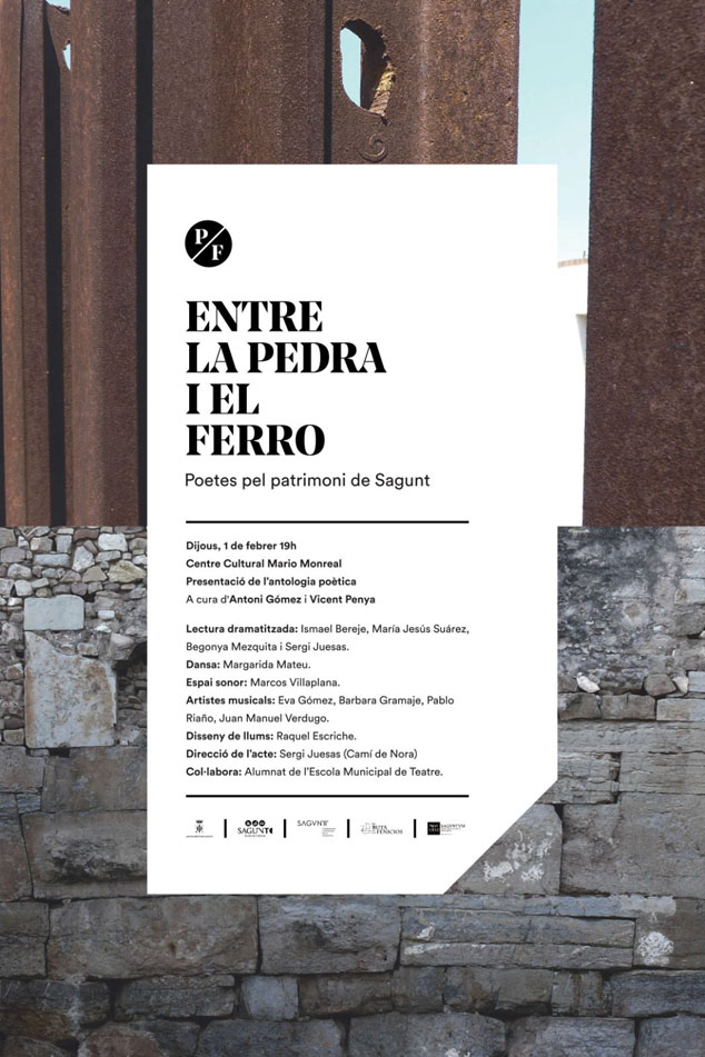 El salón de actos del Centro Cultural Mario Monreal acogerá el día 1 de febrero, a las 19 horas, la presentación de la antología poética Entre la pedra i el ferro (poetes pel patrimoni de Sagunt), un libro que se ha publicado con motivo del proceso de reconocimiento internacional de la ciudad de Sagunto, a través de la presentación de la candidatura a Patrimonio de la Humanidad, y que ha contado con la colaboración del Ayuntamiento de Sagunto y otras entidades.