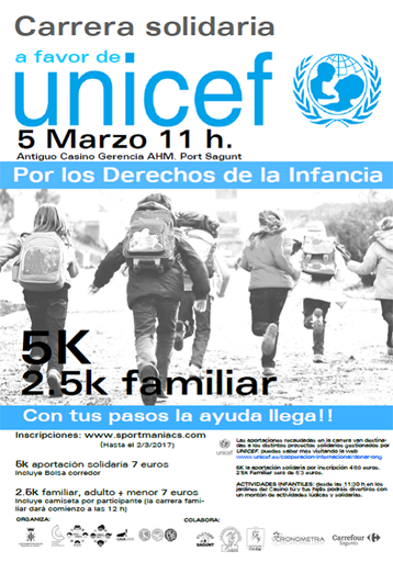 La prueba, que tiene un componente solidario al colaborar con UNICEF a favor de los Derechos de los Niños y las Niñas, recorrerá el casco urbano del Puerto de Sagunto y partirá desde el Antiguo Casino Gerencia AHM. Para la carrera se han organizado dos modalidades; la primera de ellas es de 2,5K, de carácter familiar y no competitivo, empezará a las 12.00 horas y se podrá disfrutar corriendo, andando o incluso en carro de bebé. Por otro lado, la carrera 5K, que constará de dos vueltas al circuito, empezará a las 11.00 horas. Los cinco primeros participantes de cada sexo de la carrera 5K conseguirán un trofeo y a los menores participantes de la 2,5K familiar se los dará una medalla por la participación. También habrá actividades lúdicas y solidarias para los más pequeños, que empezarán las 11.30 horas, en los jardines del Casino.