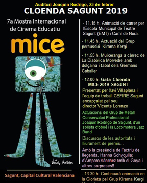 La 7ª Mostra Internacional de Cinema Educatiu se está desarrollando en Sagunto del 11 al 23 de febrero. Es un proyecto transversal que busca unir el mundo educativo y el audiovisual, al mismo tiempo que permite a las niñas y niños, adolescentes y jóvenes crear sus propios cortometrajes y poder presentarlos a concurso. En la misma, participan más de 300 cortometrajes locales e internacionales.​