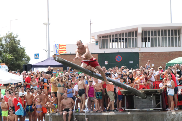 La tradicional fiesta de las cucañas se ha celebrado este miércoles, 15 de agosto, con éxito de participación. En el evento los participantes han optado a una trentena de premios que oscilaron entre los 50 y 275 euros, menos cantidad de premios que el año pasado pero de mayor cuantía. En total, la delegación de Fiestas ha repartido 3.000 euros en premios. En esta edición, se han mantenido las tres actividades: una prueba deportiva, como es la travesía a nado al puerto; la cogida de la bandera en el palo engrasado y una prueba que consistía en atrapar pelotas de goma en el agua.