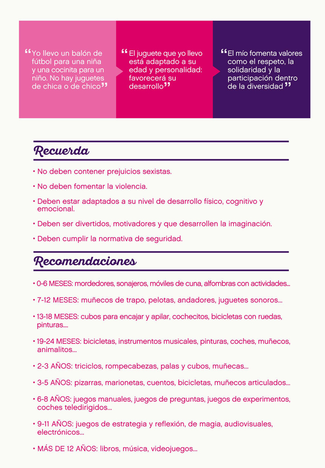 Esta campaña consiste en la distribución de un ilustrativo díptico, editado desde la delegación de Igualdad a modo de guía para orientar en la compra de juguetes no sexistas. Esta guía ofrece pautas y recomendaciones a padres y madres y, en general, sensibiliza a la población sobre la necesidad de eliminar el contenido sexista y violento de muchos juguetes y juegos. De este modo se fomenta el desarrollo de una actitud crítica sobre el consumismo y la publicidad que se genera en torno a ellos.