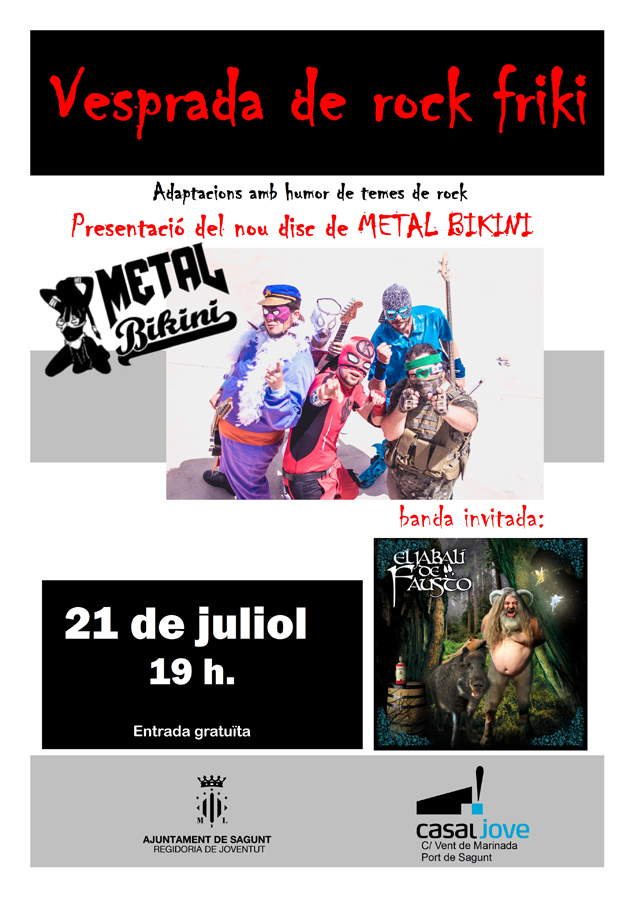 Dos grupos que interpretan adaptaciones con humor de canciones que forman parte del imaginario colectivo rockero serán los encargados de amenizar la tarde del viernes. El grupo Metal Bikini aprovechará el acto para presentar su disco. Es un grupo de Sagunto formado hace tres años dedicado a la parodia de temas de rock y heavy. Se identifican como rock friki, ya que sus letras hablan de anime, ciencia ficción, rol, videojuegos… ellos lo llaman Freak Rock Intergaláctico, combinando covers de anime con adaptaciones libres de rock y metal, desde un humor sano y apto para todos los públicos.