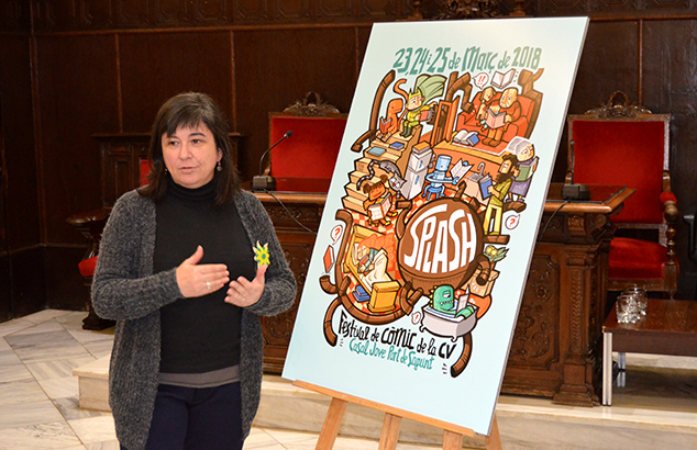 La cuenta atrás para la quinta edición del Splash Sagunt: Festival del Còmic de la Comunitat Valenciana, que se celebra los días 23, 24 y 25 de marzo en el Casal Jove de Puerto de Sagunto, ha comenzado con la presentación de su cartel, firmado por Cristina Durán. Al acto ha asistido la autora junto al alcalde de Sagunto, Quico Fernández, el concejal de Juventud, Guillermo Sampedro, y el responsable del color, Miguel Ángel Giner.
