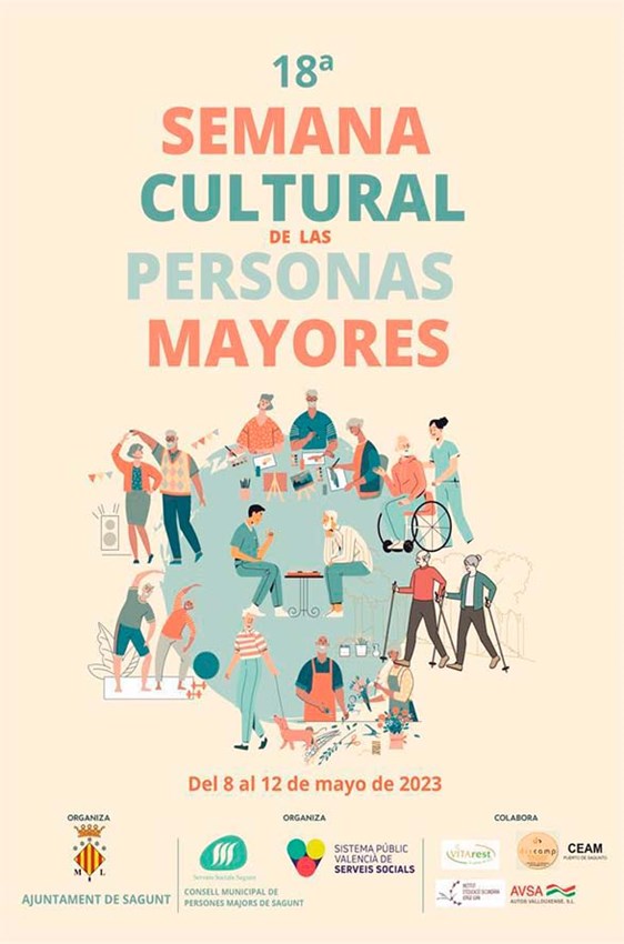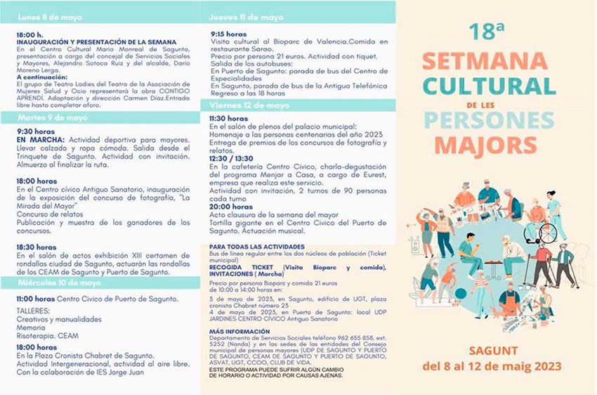 La 18ª Semana Cultural de las Personas Mayores tendrá lugar desde el lunes 8 hasta el viernes 12 de mayo, en la que se ofrecerán diferentes actividades organizadas desde el departamento de Servicios Sociales de Sagunto, con la colaboración de Consell Municipal de Persones Majors de Sagunt y el Sistema Públic Valencià de Serveis Socials, junto a diversas entidades y asociaciones.