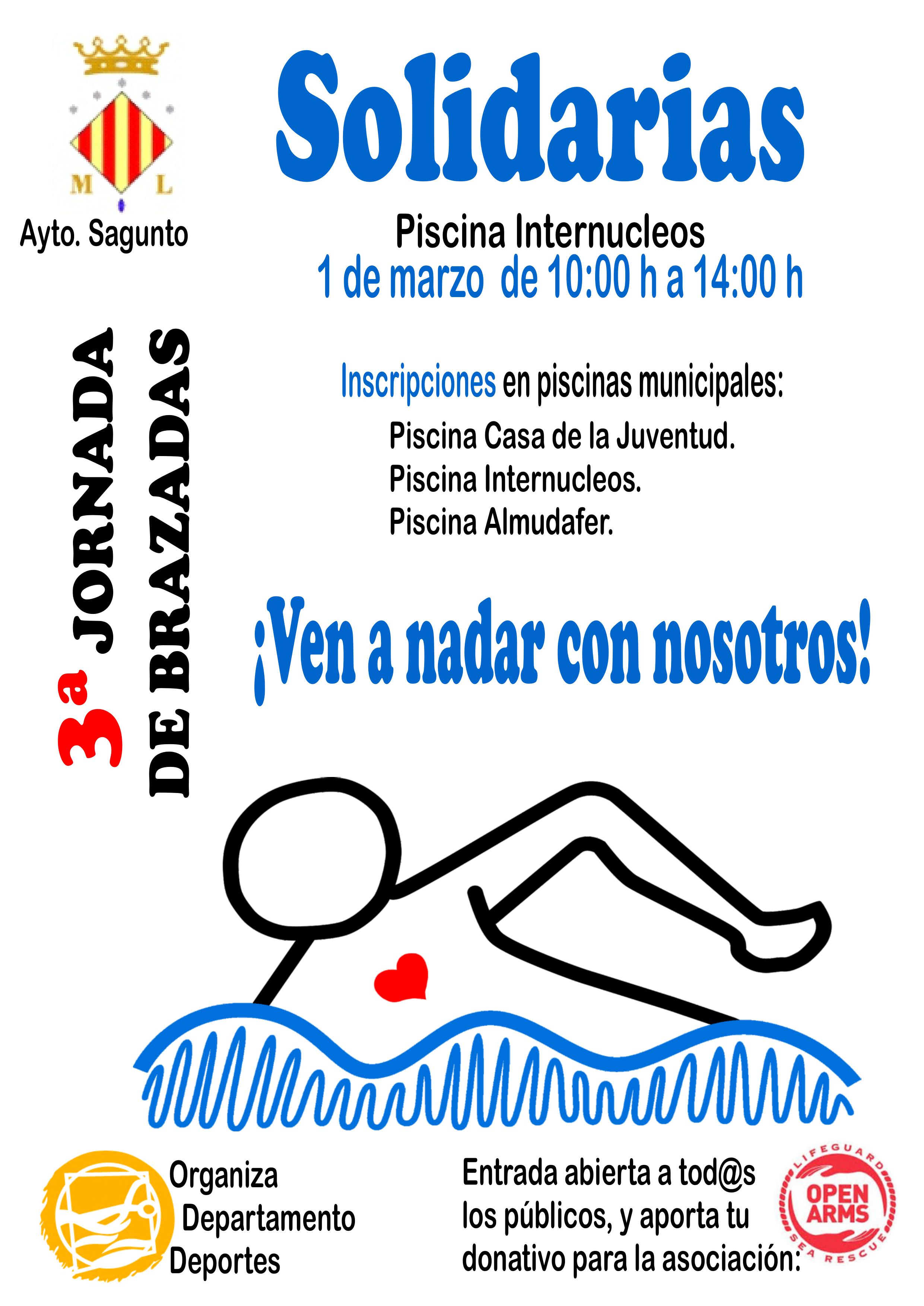El Departamento de Deportes del Ayuntamiento de Sagunto ha presentado la 3ª edición de Brazadas Solidarias. El próximo domingo 1 de marzo, de 10 a 14 horas, tendrá lugar esta jornada en la piscina del Polideportivo Municipal internúcleos abierta a todo el público.