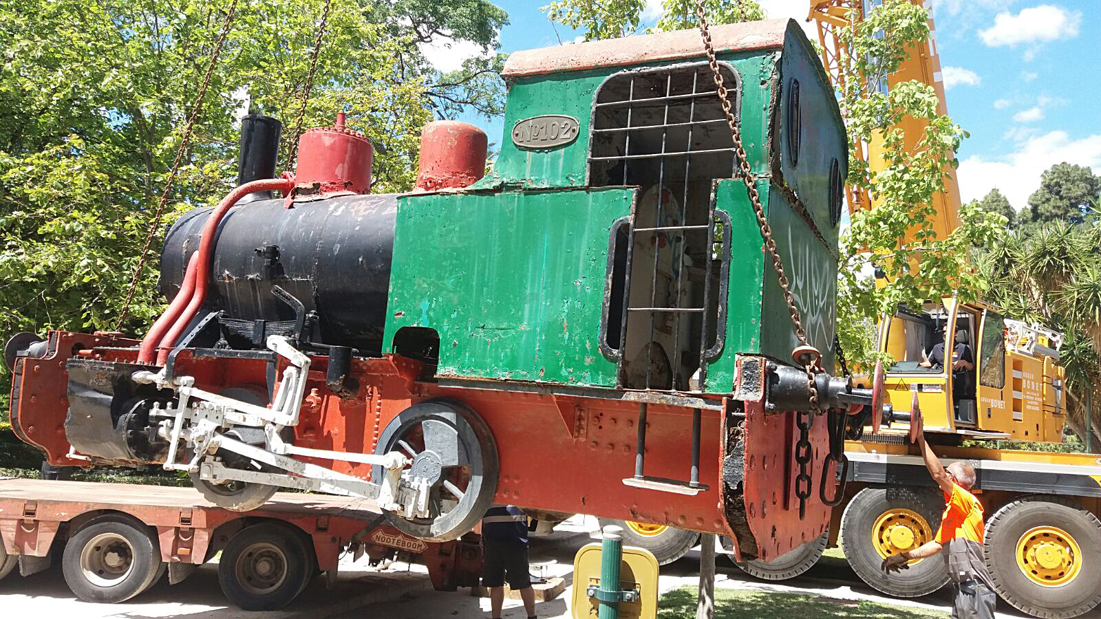 La antigua locomotora de vapor de Altos Hornos del Mediterráneo (AHM), que estaba ubicada en los jardines de Viveros en Valencia, ya se encuentra en Puerto de Sagunto. El alcalde de Sagunto, Quico Fernández, gestionó, hace unos meses, directamente con el primer edil de Valencia, Joan Ribó, el retorno de esta pieza del patrimonio industrial del municipio.