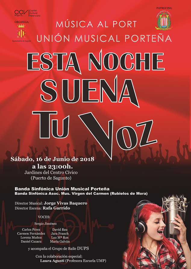 Este año, la Unión Musical Porteña en su esperado concierto de la Banda Sinfónica UMP ha contado con la colaboración de diez voces valencianas. Nueve de las voces y la profesora de canto y violín de la Escuela de Música UMP, Laura Agustí, se unirán a la Banda Sinfónica UMP para hacernos vibrar con temas pop rock y baladas. Un espectáculo musical, audiovisual y acompañado por el grupo de Danzas Urbanas de Puerto de Sagunto (DUPS), quienes escenificarán algunas de las canciones interpretadas junto a la Banda Sinfónica UMP dirigida por su director Jorge Vivas Baquero.