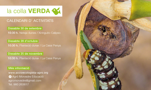 En octubre y noviembre, la Colla Verda organizará dos plantaciones de flora dunar. Concretamente, los sábados 28 de octubre y 25 de noviembre a las 10.30 horas. El punto de reunión para estas actividades será La Casa Peña, el centro de educación y voluntariado ambiental de la Marjal de Almardà-Almenara. Con estas dos plantaciones se pretende aumentar la biodiversidad de los muntanyars y consolidar su sistema dunar, que actualmente representa una de las pocas defensas que tiene nuestra franja costera contra la erosión litoral.