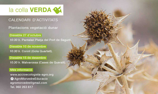 La Colla Verda, el proyecto de voluntariado ambiental del Ayuntamiento de Sagunto y Acció Ecologista-Agró, ha organizado para este otoño una campaña de actividades en las playas de Sagunto. Concretamente, tres plantaciones de flora dunar. La primera fue el sábado 27 de octubre junto al Pantalán y ahora se va a realizar otra el próximo 10 de noviembre en la playa de Corinto. El objetivo de esta convocatoria es mejorar la biodiversidad de esta playa urbana.