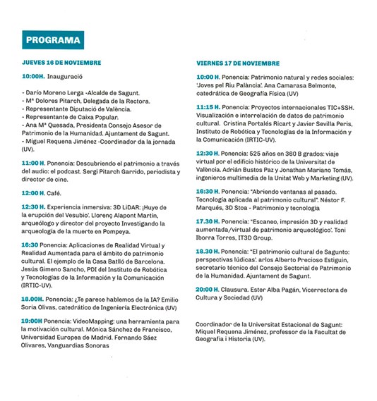 La digitalización e impresión en 3D, el videomaping, los podcasts, la realidad virtual inmersiva, la realidad aumentada, la inteligencia artificial, las redes sociales, los videojuegos, etcétera son algunas de las técnicas empleadas para generar lenguajes y sensaciones completamente nuevos a la hora de conocer, valorar y disfrutar del patrimonio son algunas de las temáticas que se van a abordar en la presente edición de la Universidad de Otoño de Sagunto.