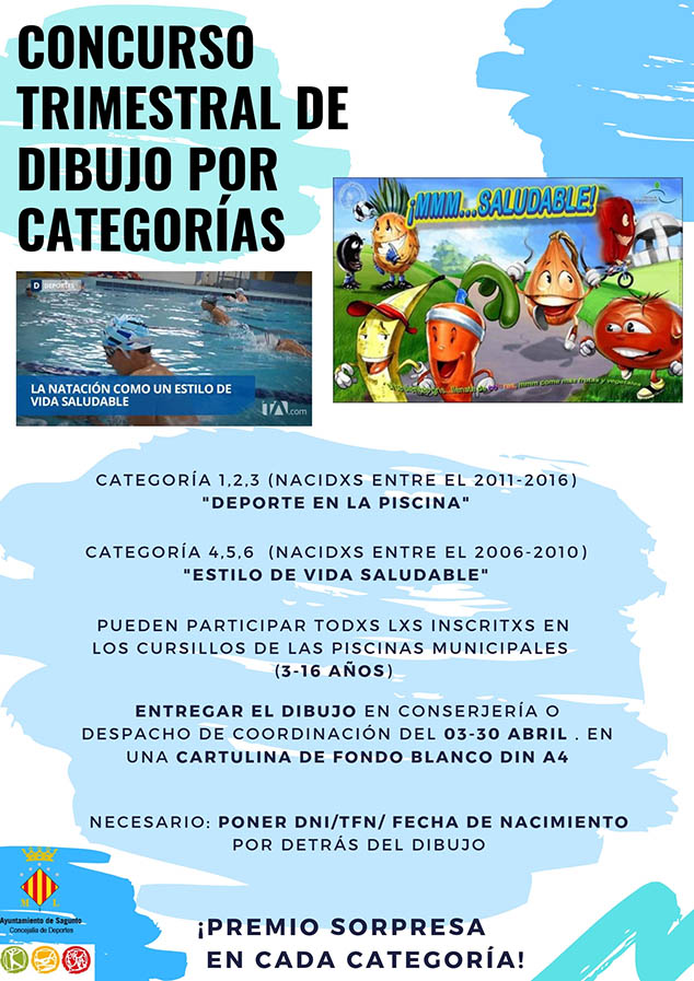 La participación en el concurso está dirigida a los inscritos e inscritas en los cursillos de las piscinas municipales que tengan entre 3 y 16 años, y se participará por categorías. En las categorías 1, 2 y 3 participarán los nacidos entre 2011 y 2016, bajo el lema ‘Deporte en la piscina’; en la categoría 4, 5 y 6, participarán los nacidos entre 2006 y 2010, bajo el lema ‘Estilos de vida saludable’.