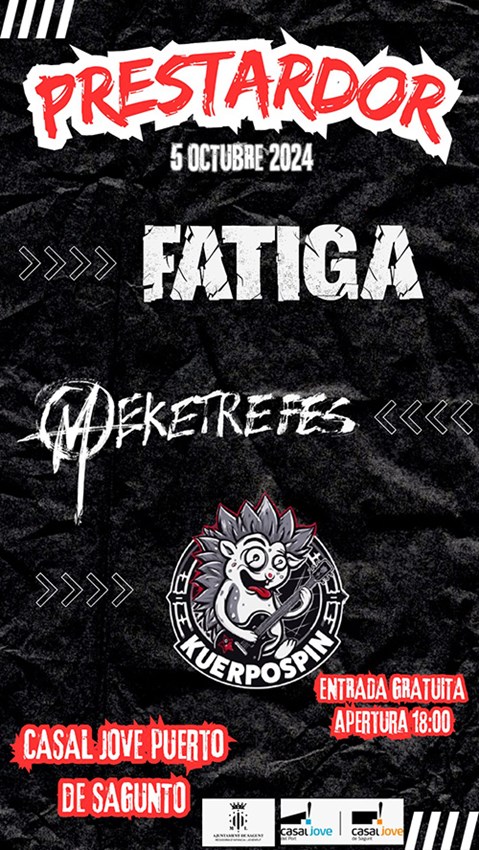 El Prestardor es un evento musical gratuito que ha organizado la concejalía de Juventud e Infancia para el sábado 5 de octubre, aprovechando la celebración del Festardor. Las bandas invitadas al Prestardor son Fatiga, Meketrefes y Kuerpospin, cuyos conciertos podrán disfrutarse en el Casal Jove de Puerto de Sagunto a partir de las 18:30 horas, aunque las puertas del recinto permanecerán abiertas desde media hora antes.