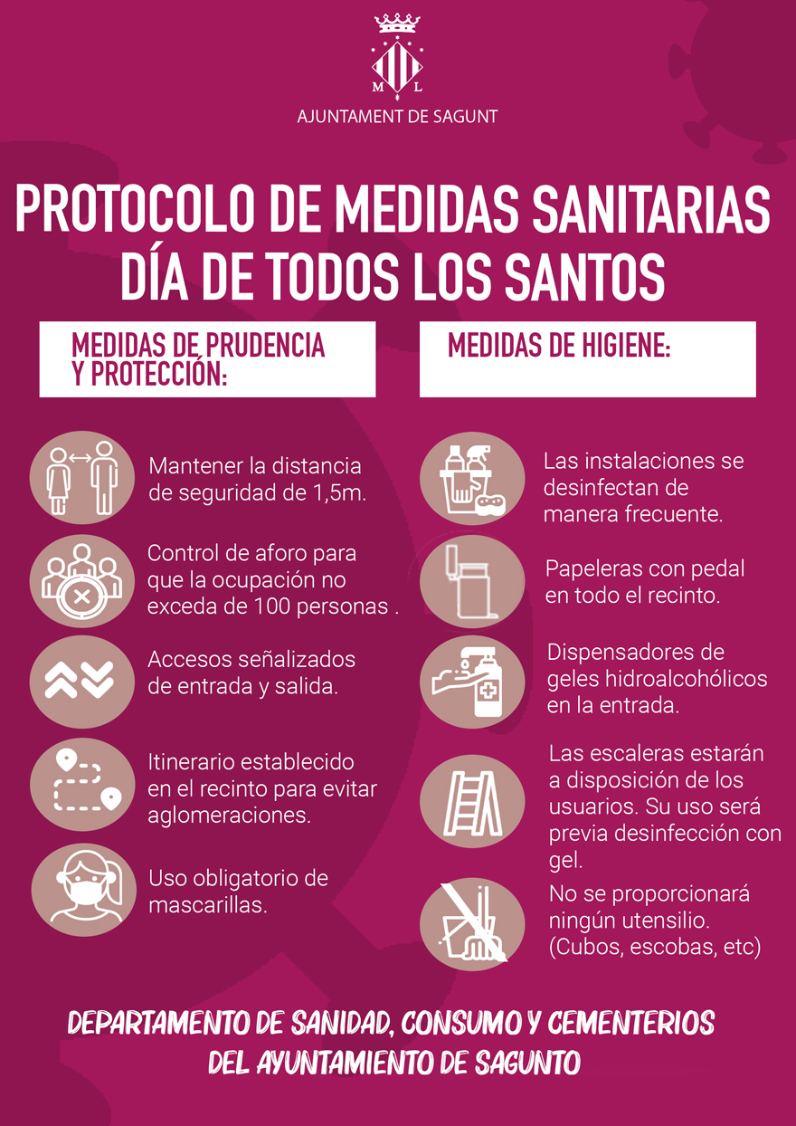 La Concejalía de Sanidad, Consumo y Cementerios del Ayuntamiento de Sagunto ha establecido un protocolo con una serie de medidas sanitarias en los cementerios municipales con motivo de la festividad de Todos los Santos, ya que se prevé una asistencia masiva y, en consecuencia, existe riesgo de aglomeraciones y contacto estrecho entre personas.