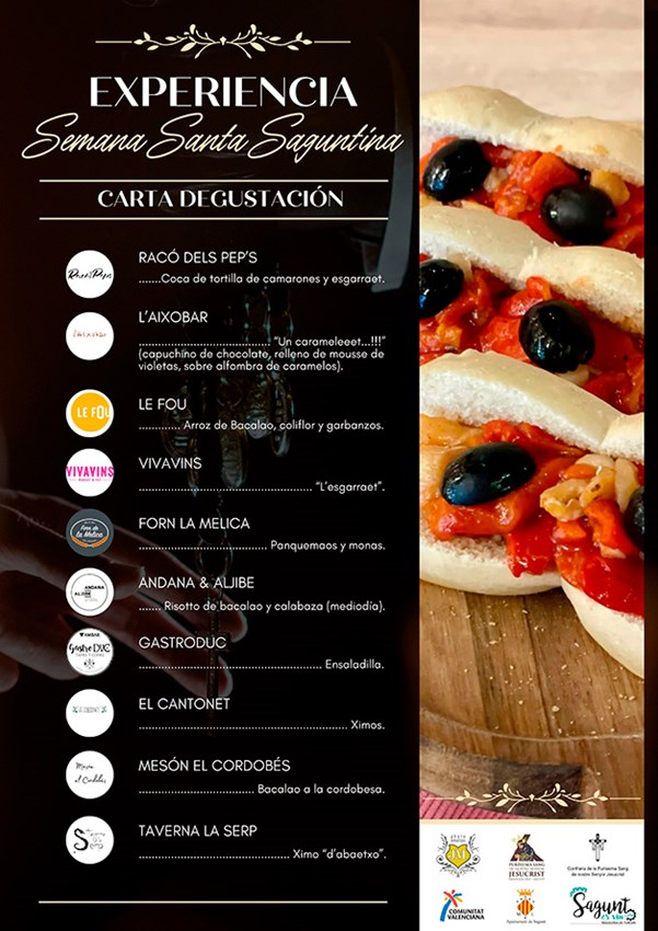 Y, para completar esta experiencia, en cada uno de los vídeos aparecerá una relación de establecimientos colaboradores que durante los dos meses tendrán en su carta algún plato típico de la Semana Santa Saguntina, desde ximos hasta esgarraet o bacalao, etcétera. Los establecimientos que participan son Racó dels Pep's, L'Aixobar, Le Fou, Vivavins, Forn La Melica, Andana & Aljibe, Gastroduc, El Cantonet, Mesó El Cordobés y Taverna de la Serp.