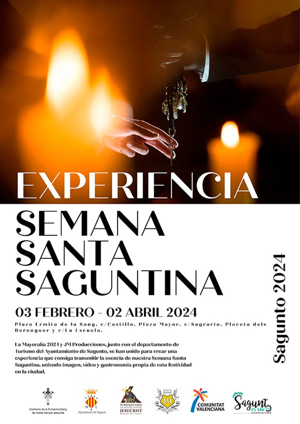 La Experiencia Semana Santa Saguntina se dará a conocer el 3 de febrero en la Ermita de la Sang a las 17 horas. La inauguración comenzará de una manera especial, con un concierto de la banda CCTT Morvedre que tendrá lugar el mismo día a las 18:15 horas en la plaza Mayor. Será un concierto narrado que contará con el Viernes Santo saguntino, representando la procesión del Vía Crucis en el Calvario. Se contará con la colaboración de Collet, que cumple su 70 aniversario tocando esas notas características de la Semana Santa Saguntina. También estará representada la figura de los plegadores de la cofradía.