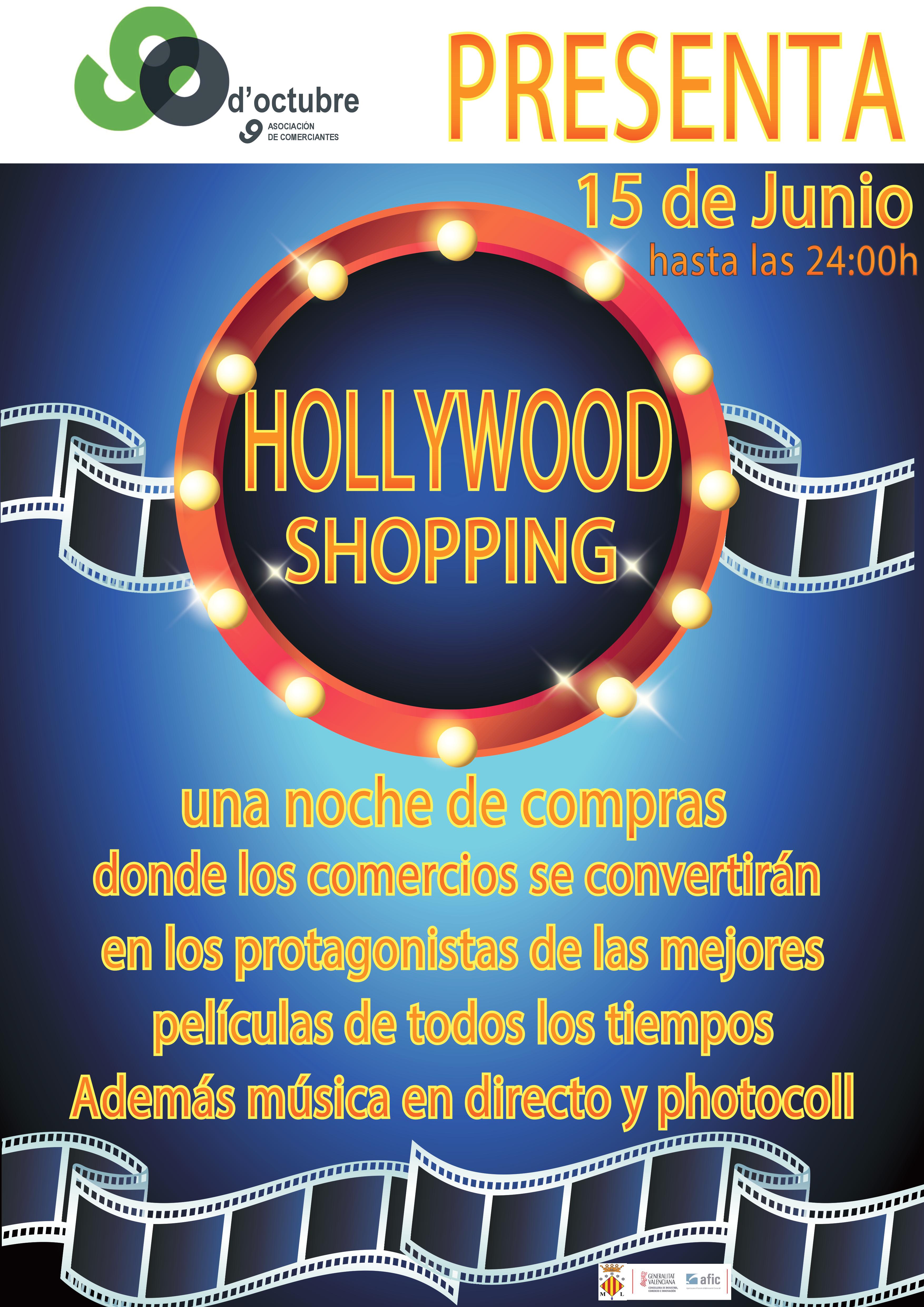 La delegación de Comercio del Ayuntamiento de Sagunto colabora con la “Shopping night-Hollywood”. Este próximo jueves 15 de junio, desde las 20.00 hasta las 24.00 horas, los comercios de la avenida 9 de Octubre se vuelcan con sus clientes.