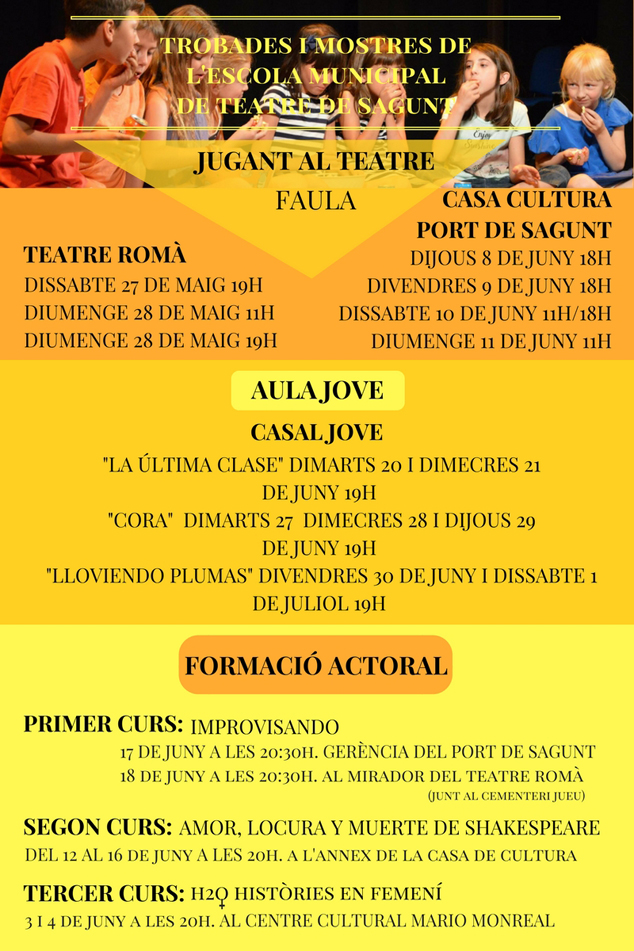 El Casal Jove será el escenario de las representaciones de Aula Jove. El martes 20 y el miércoles 21 de junio a las 19 horas, será el turno de la representación La última clase; el martes 27, el miércoles 28 y el jueves 29 de junio, los adolescentes del grupo interpretarán la obra Cora; y para finalizar, el alumnado pondrá en escena la representación Lloviendo plumas el viernes 30 de junio y el sábado 1 de julio a las 19 horas.