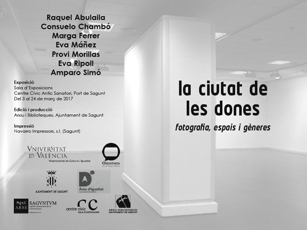 La ciutat de les dones. Fotografia, espais i gènere a partir de las 19.30 horas. Se trata de una muestra fotográfica que está enmarcada en el programa de actos en conmemoración del 8 de Marzo, Día Internacional de la Mujer, organizada por la concejalía de Igualdad del Ayuntamiento de Sagunto, con la colaboración de la Universidad de Valencia.