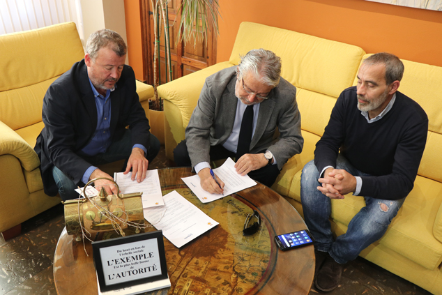 El alcalde de Sagunto, Quico Fernández y el presidente de Fundación Bancaja, Rafael Alcón han firmado esta mañana un convenio de colaboración mediante el que la Fundación Bancaja dona al Ayuntamiento de Sagunto el mural 'Luz y sol', del artista Joaquín Michavila. También ha asistido el concejal de Patrimonio Cultural, Pablo Abelleira. Este acuerdo de colaboración se enmarca en las iniciativas culturales desarrolladas por el municipio saguntino que la Generalitat Valenciana ha designado como Capital Cultural Valenciana (CCV) 2018-2019, un reconocimiento que destaca la amplia oferta cultural de Sagunto. Mediante este acuerdo, el mural será restaurado y cambiará su ubicación a una de las fachadas del Museo Industrial de Sagunto.