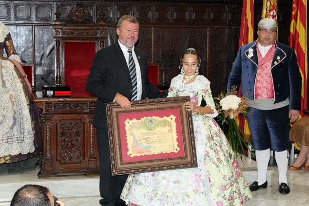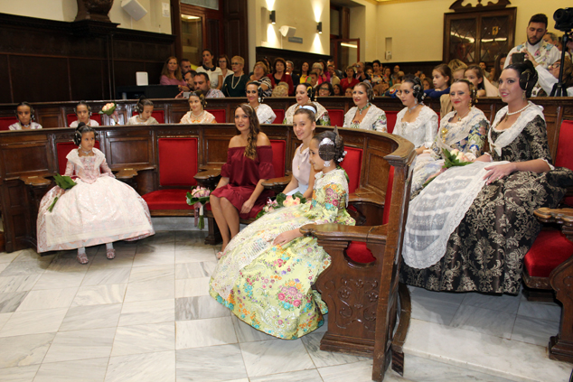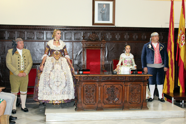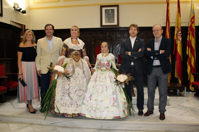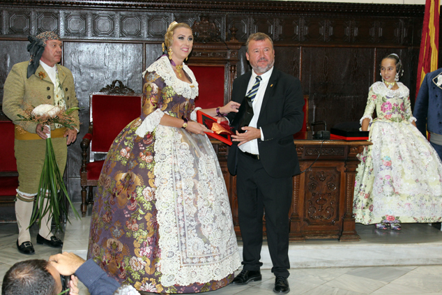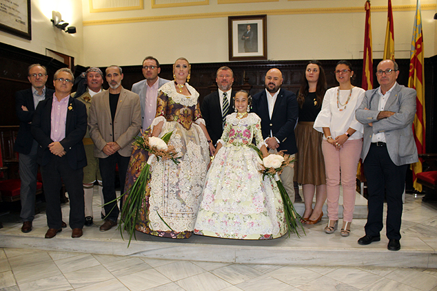 El salón de plenos del Ayuntamiento de Sagunto fue el lugar donde, el viernes, se proclamó a Mª del Mar Gimeno López y Andrea Escribá Fernández como nuevas falleras mayores de FJFS, en un acto presidido por el alcalde, Quico Fernández, que también contó con la presencia de las Falleras Mayores de Federación Junta Fallera de Sagunto 2017, Raquel Martín Genovés y Ana Isabel Dorado Capsí; el presidente de la FJFS, Rafael Burgos; el alcalde de Gilet, Salvador Costa Escribá; el mantenedor de la exaltación, Enric Cuenca Teruel; la madrina de la Associazione Targa Cecina, Sara Piangatelli, y concejales de la Corporación Municipal, así como falleras y falleros del Camp de Morvedre. El alcalde, además de proclamarlas como las máximas representantes de las fiestas josefinas de Sagunto, les hizo entrega de los cuadros acreditativos, así como de las peinetas oficiales que lucirán durante su reinado y que llevan grabado el escudo de la ciudad de Sagunto.