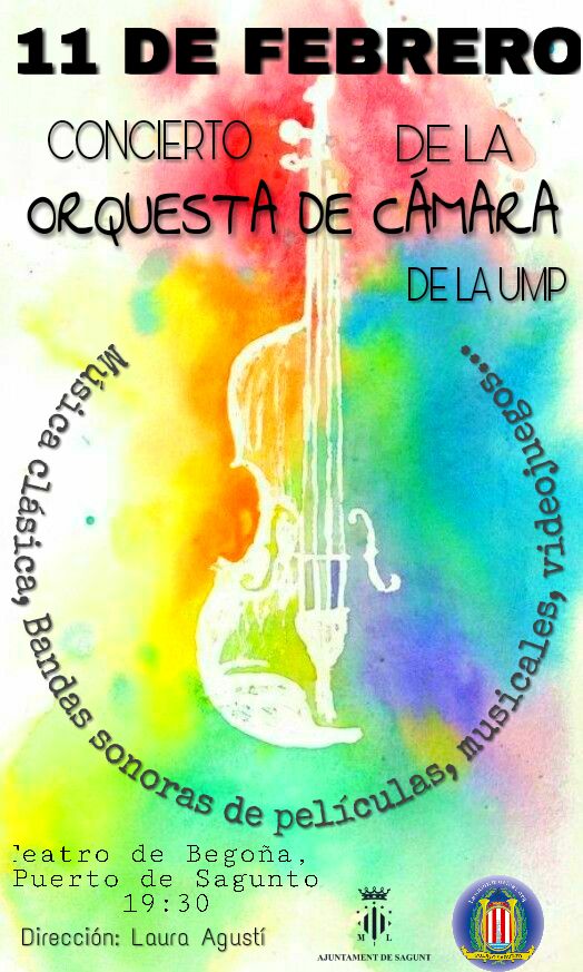 La orquesta de cámara de la Unión Musical Porteña interpretará un concierto el próximo domingo 11 de febrero a las 19.30 h en el Teatro Begoña de Puerto de Sagunto. La joven orquesta ofrecerá un repertorio muy variado, que incluye música clásica, bandas sonoras de películas, musicales y música de videojuegos, todo ello a las órdenes de su directora Laura Amanda Agustí.