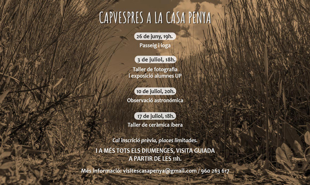 Las actividades son gratuitas pero las plazas son limitadas y se debe realizar una inscripción previa a través del correo electrónico visitescasapenya@gmail.com o llamando al 960 263 617 (de lunes a viernes, de 9 a 14 h).