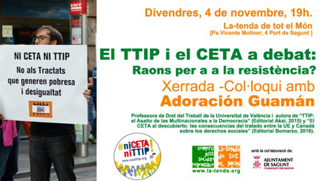 La charla-debate “El TTIP y el CETA a debate: ¿Razones para la Resistencia?” será el viernes 4 de noviembre a las 19:00h en la sede de la asociación La Tenda de Tot el Món, pasaje Vicente Moliner 4 de Puerto de Sagunto. Estará a cargo de la experta Adoración Guamán, profesora de Derecho del Trabajo de la Universitat de València y Directora del Máster en Derecho Electoral y Observación Electoral Internacional.