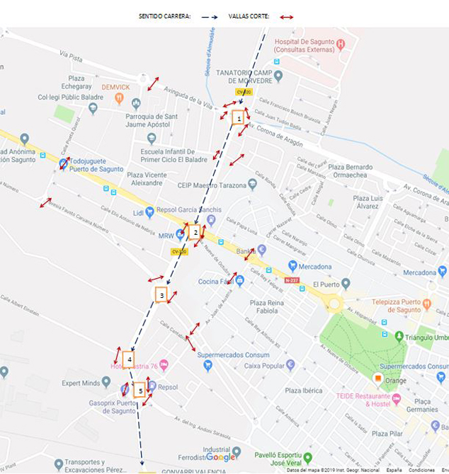 El itinerario del recorrido de La Vuelta que pasa por Puerto de Sagunto entrará al municipio por la CV-309, llegará a la rotonda del Hospital y seguirá en línea recta todas las rotondas siguiendo las calles Diputación y Jaume Roig. Finalmente saldrá de la localidad hacia Puçol y el Puig por la CV 309 (conocida como carretera IV Planta).
