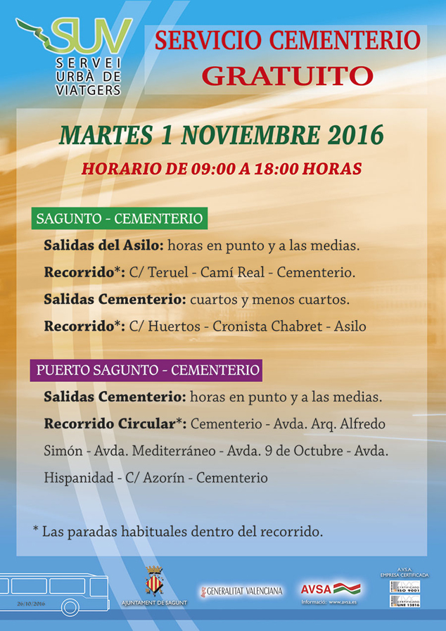 En concreto, desde el 28 de octubre hasta el 1 de noviembre, los dos cementerios estarán abiertos de 8.00 a 18.00 horas de manera ininterrumpida. En cuanto al servicio gratuito de autobuses, tendrá un horario de 9.00 a 18.00 horas. El recorrido del autobús del núcleo de Sagunto comenzará en el asilo y seguirá por las calles Teruel, Camí Reial, cementerio, avenida País Valencià, Huertos, plaza Cronista Chabret, avenida Dr. Palos y asilo. El autobús saldrá del asilo a las horas en punto y a las medias. Por su parte, en Puerto de Sagunto, el recorrido comenzará en el cementerio (también a las horas y a las medias) y seguirá por la avenida Arquitecto Alfredo Simón, avda. Mediterráneo, 9 d’Octubre, Hispanidad, calle Azorín y llegada al cementerio.